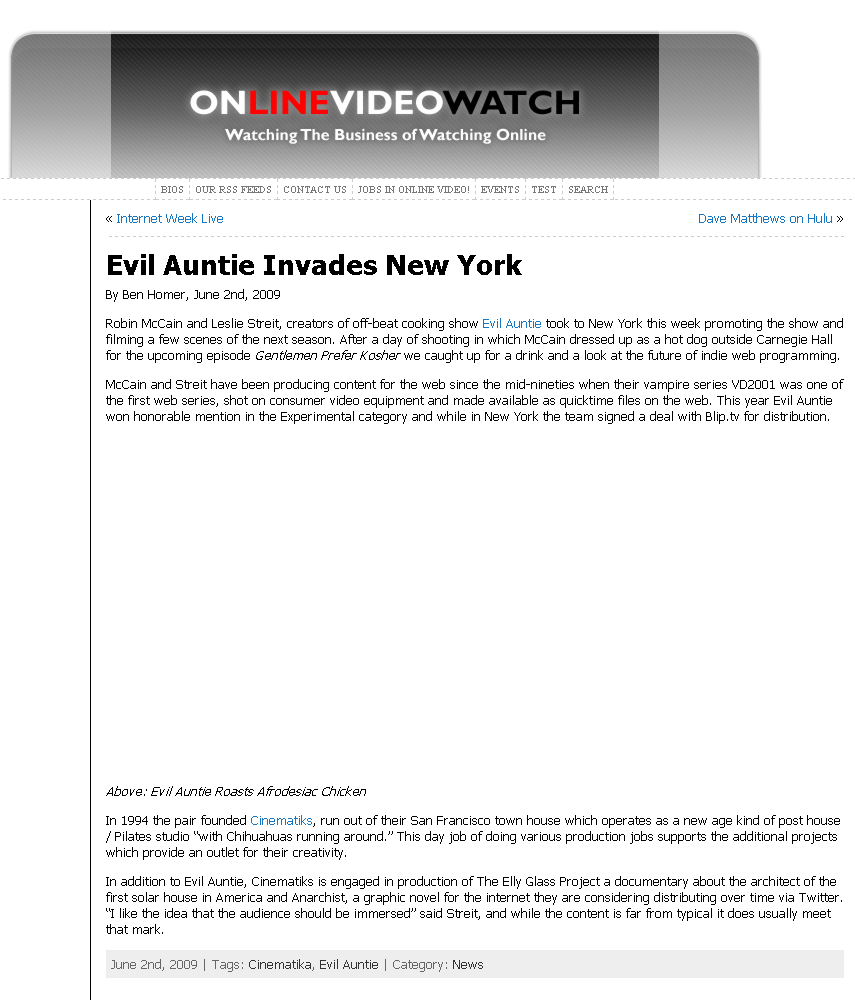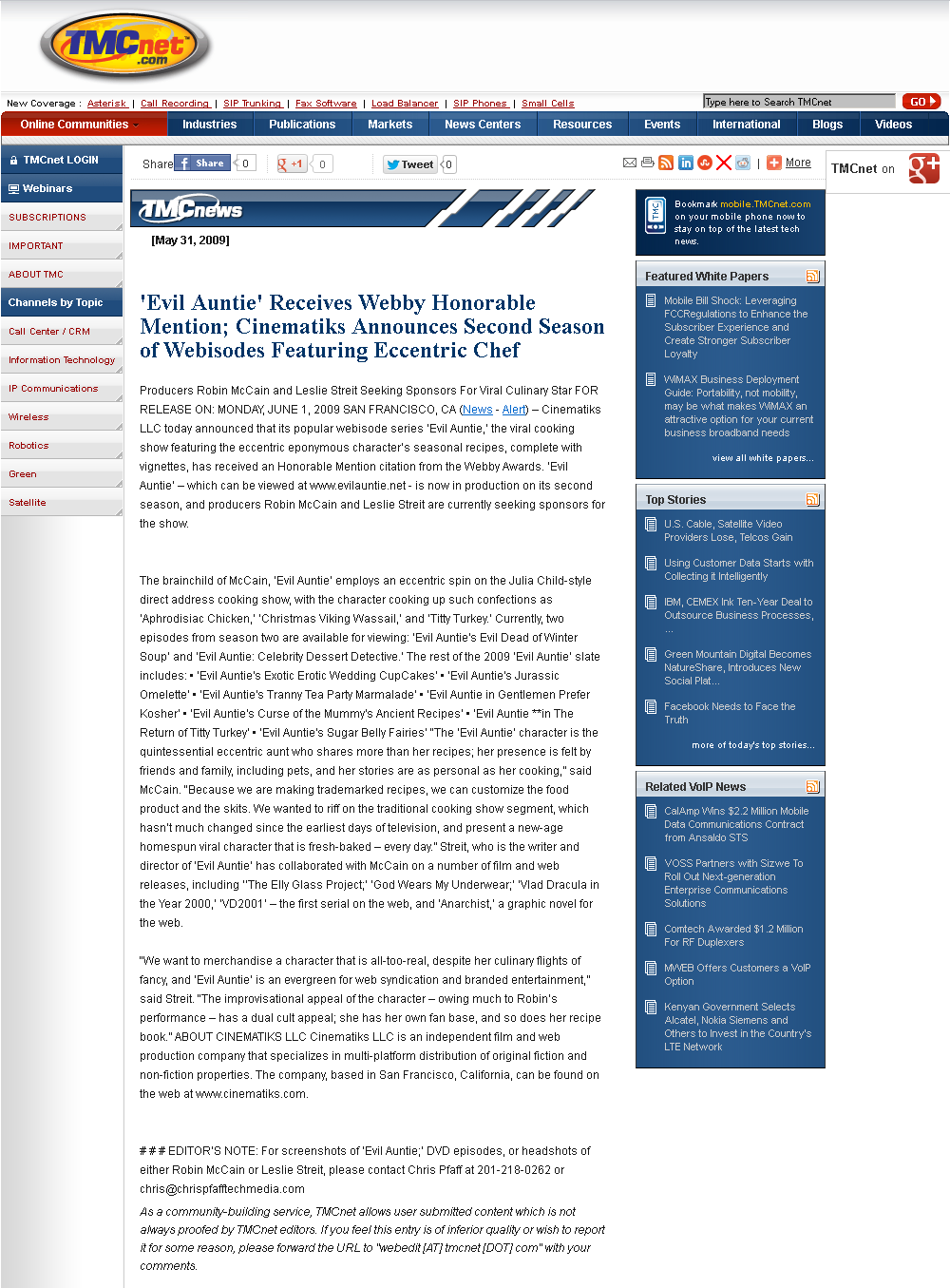 'Evil Auntie' Receives Webby Honorable Mention; Cinematiks Announces Second Season of Webisodes Featuring Eccentric Chef